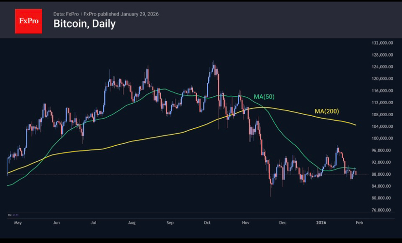 En Bitcoin, el miércoles por la noche se ejecutó otro lote de transacciones de venta en los intentos del mercado de superar los $90K, fallando en otro intento de volver a estar por encima de la media móvil de 50 días. Esta curva se inclina suavemente hacia abajo, reforzando aún más los argumentos bajistas. Por otro lado, BTC aún no ha comenzado una disminución activa después de la consolidación. Una señal formal para comenzar podría ser la ruptura del soporte cerca de $85K. La pregunta importante es, si los metales se giran bruscamente hacia abajo, ¿esto ayudará a las criptomonedas, devolviendo el interés en ellas, o dañará aún más? Nos inclinamos por la segunda opción debido al desapalancamiento potencial, que es peligroso para todos los activos de riesgo en la primera etapa. Este es un estado de zugzwang, donde el siguiente movimiento solo empeora la situación.