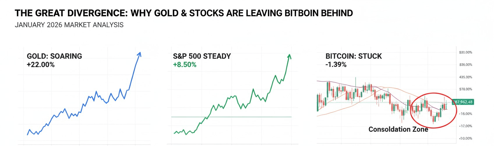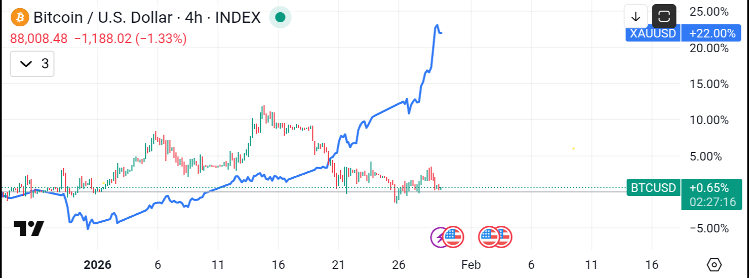 La Estrategia: Mantén un ojo atento en esa Línea Azul (Oro). Históricamente, una vez que el Oro termina su masivo rally y comienza a moverse lateralmente, ese "dinero de seguridad" generalmente fluye de regreso a Bitcoin para el próximo gran aumento.