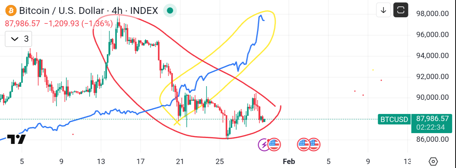 Las Velas Principales (Bitcoin): Este es el "Oro Digital" que ha estado en silencio. Mientras el Oro alcanza nuevos máximos, Bitcoin está luchando por mantenerse por encima de $88,000. Actualmente está atrapado en una tendencia a la baja (el círculo rojo en el gráfico).