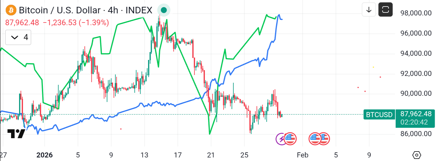 Mirando nuestro gráfico de 4 horas, las tres líneas cuentan tres historias muy diferentes:
