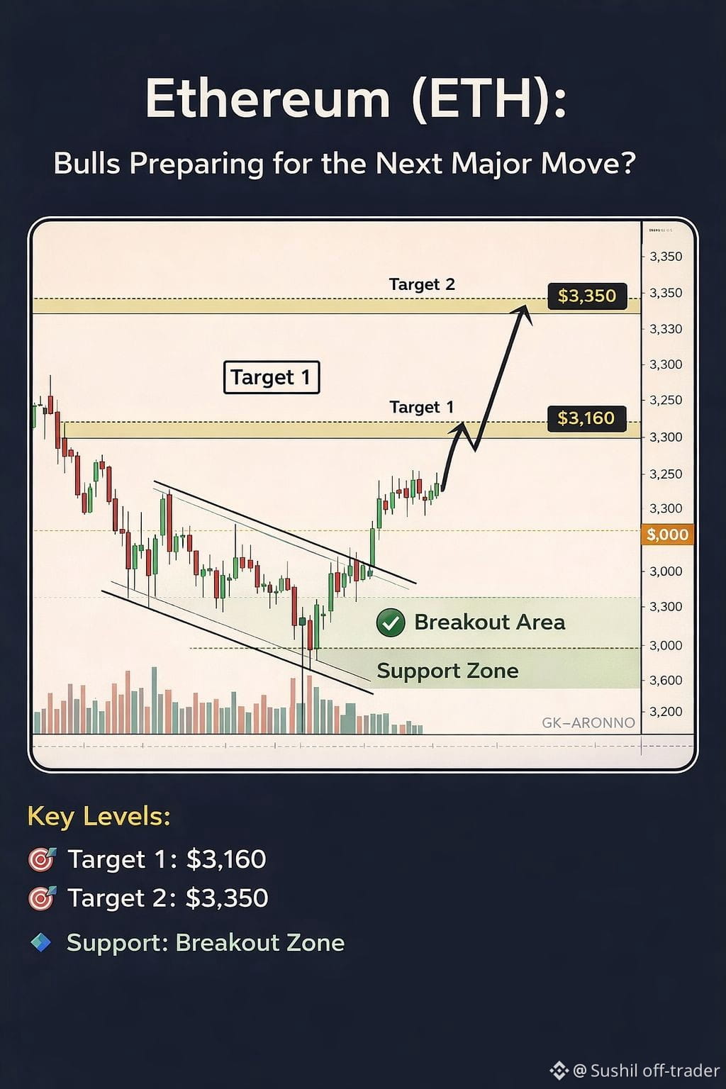 ETH previously delivered a strong upside impulse, confirming bullish market intent. After that move, price retraced in a controlled manner, forming a descending channel / falling wedge-like structure. Such corrections are considered constructive in an uptrend, as they allow the market to reset momentum without breaking the overall bullish structure.