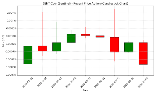 El gráfico a continuación ilustra la reciente acción del precio diario de SENT, mostrando el rechazo en la resistencia de $0.0011 y la consolidación actual cerca de $0.0008.
