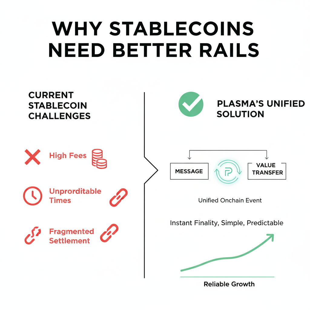 Plasma no afirma resolver todos los desafíos, los puntos de salida, la regulación y la educación del usuario siguen siendo importantes. Pero al unificar la mensajería y la liquidación en un solo paso claro en la cadena, Plasma hace que los pagos con stablecoins sean más como transferencias de efectivo cotidianas: confiables, predecibles y diseñadas para escalar.