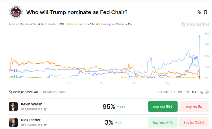 Casi al mismo tiempo, múltiples fuentes y datos del mercado de predicciones centraron la atención en la misma persona: el exgobernador de la Reserva Federal, Kevin Warsh. El mercado de predicciones Polymarket mostró que la probabilidad de que Warsh fuera nominado se disparó al 95%.