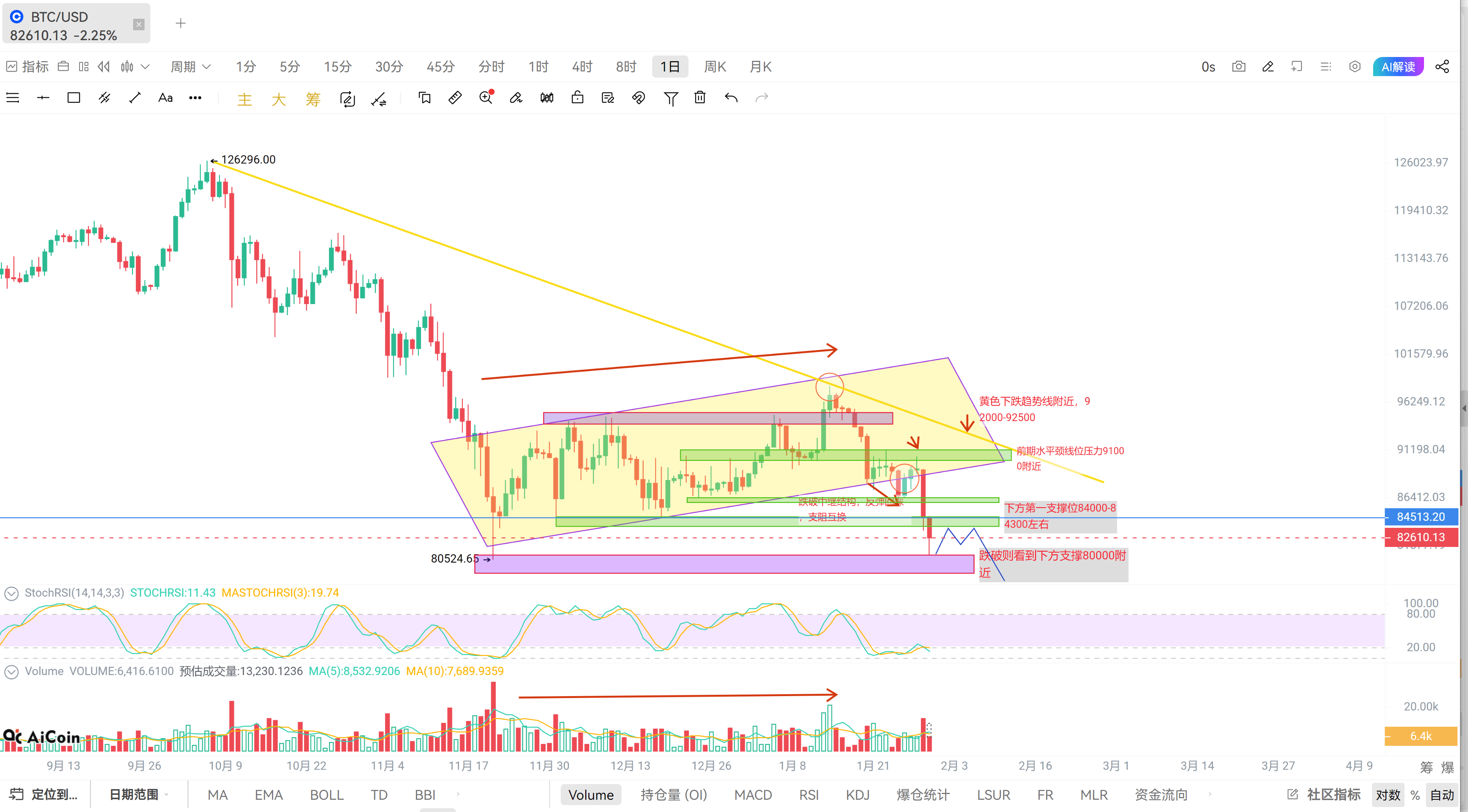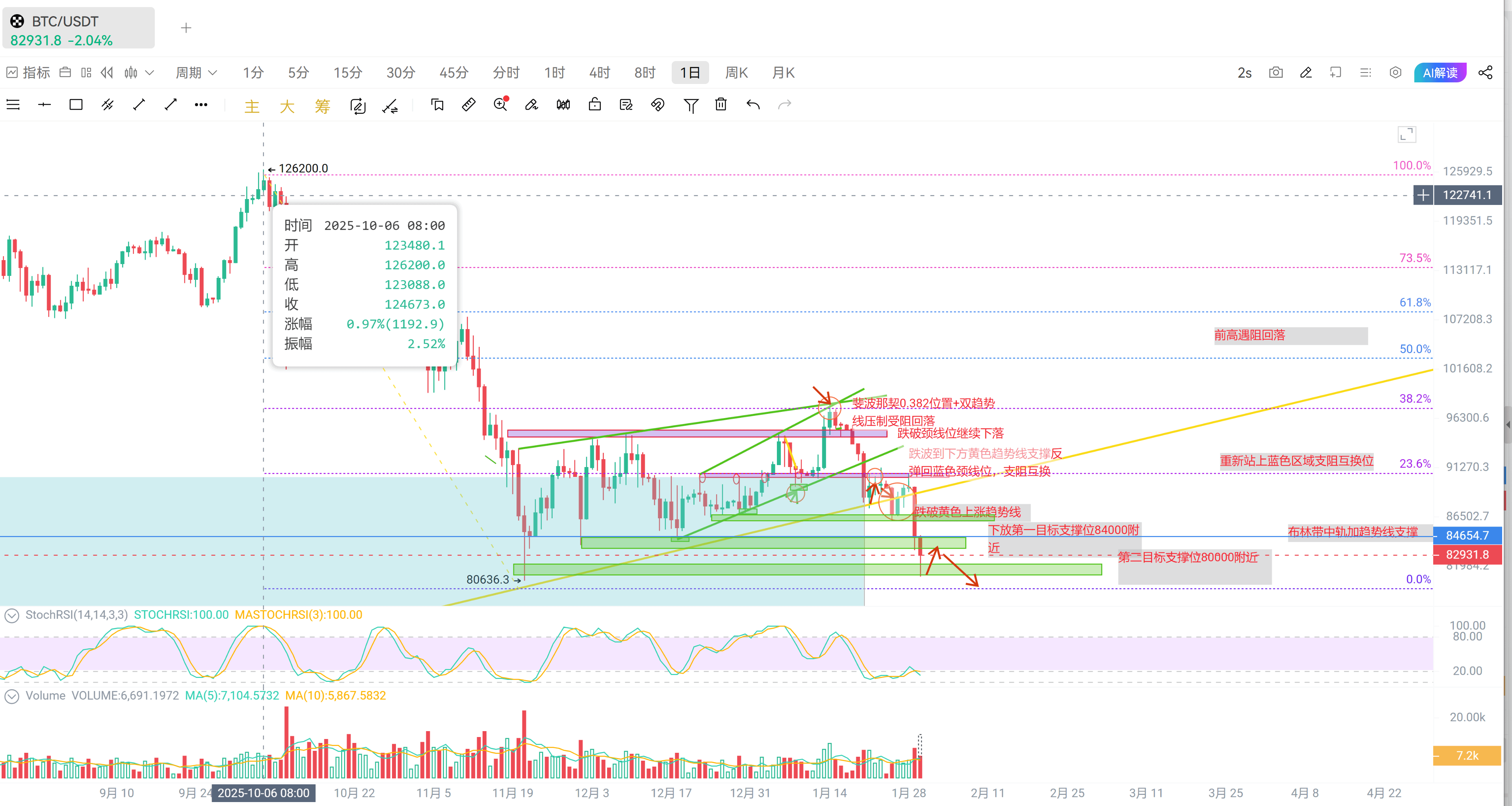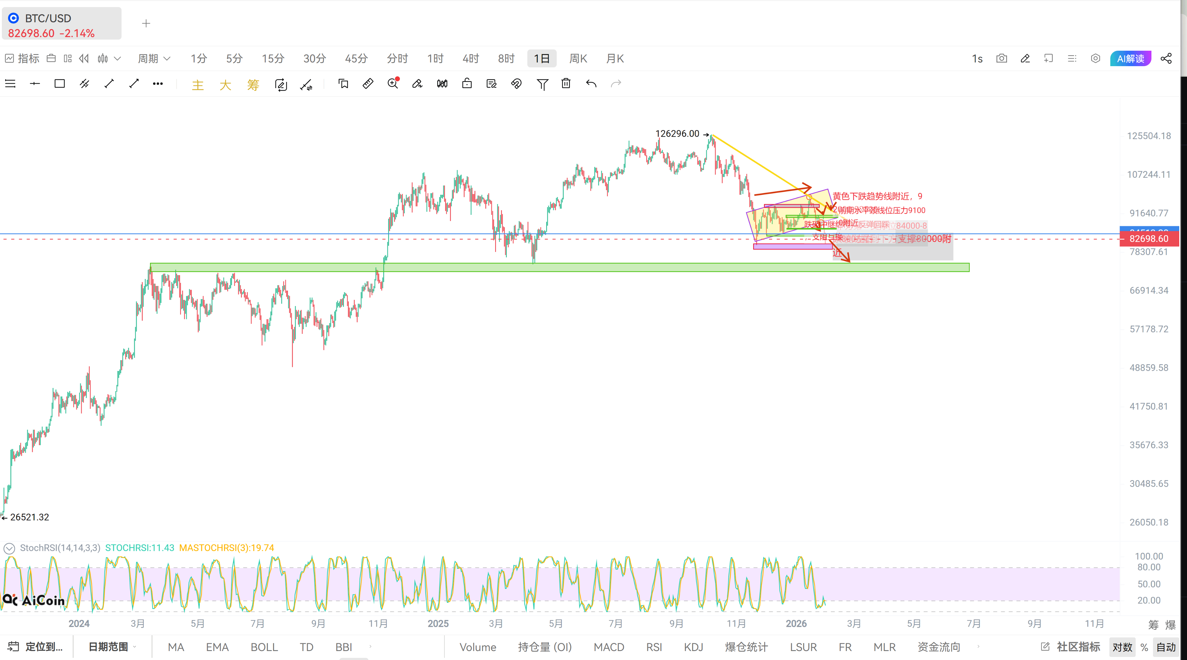 El gran pastel actualmente cotiza a más de 82000. Durante este tiempo, he estado sugiriendo la idea de hacer cortos en niveles altos. Hoy, el mínimo también ha caído a alrededor de 81000, alcanzando prácticamente nuestro primer objetivo a medio plazo de aproximadamente 80000, siguiendo completamente el movimiento que hemos analizado y proyectado. Vamos a revisar un poco este período en el que he analizado el movimiento; los detalles se pueden encontrar en todos mis análisis de mercado de este tiempo.