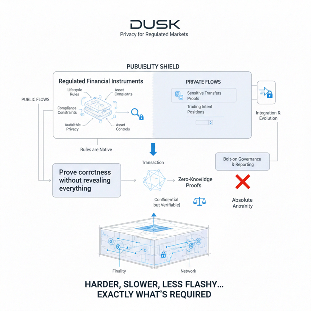 Dusk La privacidad en ese entorno tampoco puede ser absoluta. Las instituciones no solo necesitan confidencialidad—necesitan confidencialidad que aún pueda ser auditada cuando sea requerido. Esa es la razón por la que mucho del trabajo más profundo de Dusk no es simplemente “ocultar transacciones,” sino “probar la corrección sin revelar todo.” En términos prácticos, eso significa construir sistemas donde alguien pueda verificar que una transacción siguió las reglas, sin aprender los detalles sensibles. Es el tipo de diseño que es más difícil, más lento, y menos llamativo, pero es exactamente lo que la infraestructura financiera regulada demanda.
