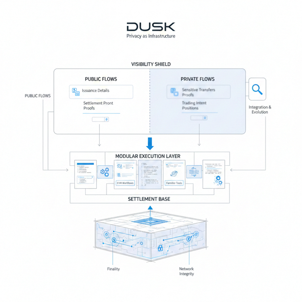 Dusk se inclina hacia un enfoque de “elegir la visibilidad correcta”. Soporta flujos tanto públicos como privados, porque la actividad financiera no es de talla única. Algunas cosas deberían ser abiertas—como ciertos detalles de emisión o pruebas de asentamiento—mientras que otras cosas deben permanecer protegidas—como transferencias sensibles, intenciones de trading o posiciones. Esa filosofía se refleja en toda la pila: no es privacidad como una vibra, es privacidad como infraestructura.