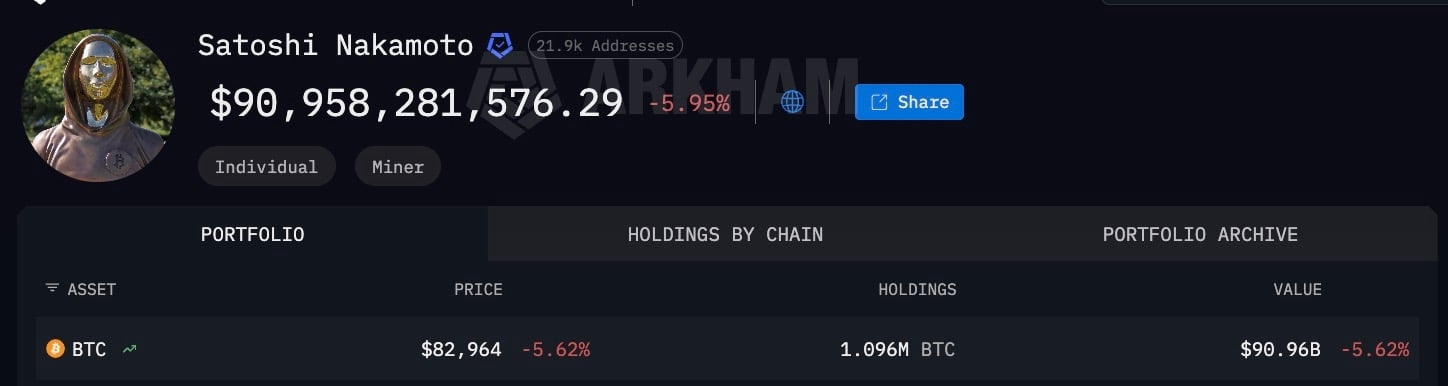 La entidad «Satoshi Nakamoto» de Arkham, que agrupa 21,900 direcciones atribuidas a la etapa temprana de minería del creador, muestra un valor de cartera de casi 91 mil millones de dólares después de la caída del BTC a 82,964 dólares, lo que representa una disminución del 5,62% en un día, con activos totales, totalizando 1.096 millones de BTC.