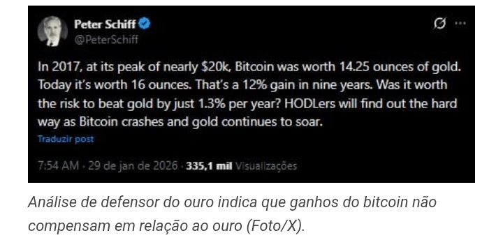 Y los números están mostrando: enero de 2026 cerró con la peor cotización del BTC, cayendo a 81 mil dólares el jueves (29) y 83 mil el viernes (30). Ya el oro, que alcanzó 5,45 mil dólares el jueves, retrocedió a 4.874 el viernes, pero aún debería cerrar el mes en alza.