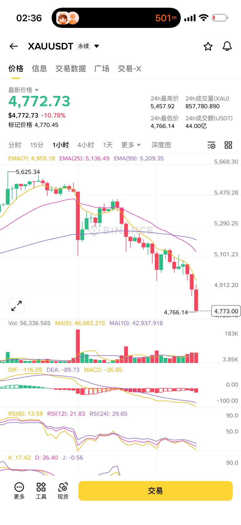 Comportamiento del precio: el oro ha caído desde un pico cercano a $5,625 y actualmente ha caído por debajo de $4,800, con una disminución del -10.78%. Esto se considera una situación de 'cisne negro' extrema en el comercio de oro.