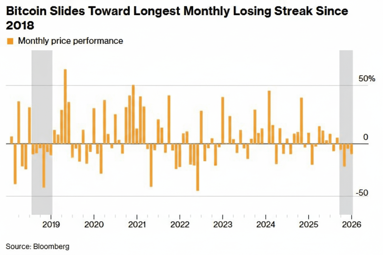 Bitcoin está navegando actualmente por un momento histórico crítico. Según los últimos datos de Bloomberg, $BTC se está deslizando hacia su racha de pérdidas mensual más larga en casi 7 años.