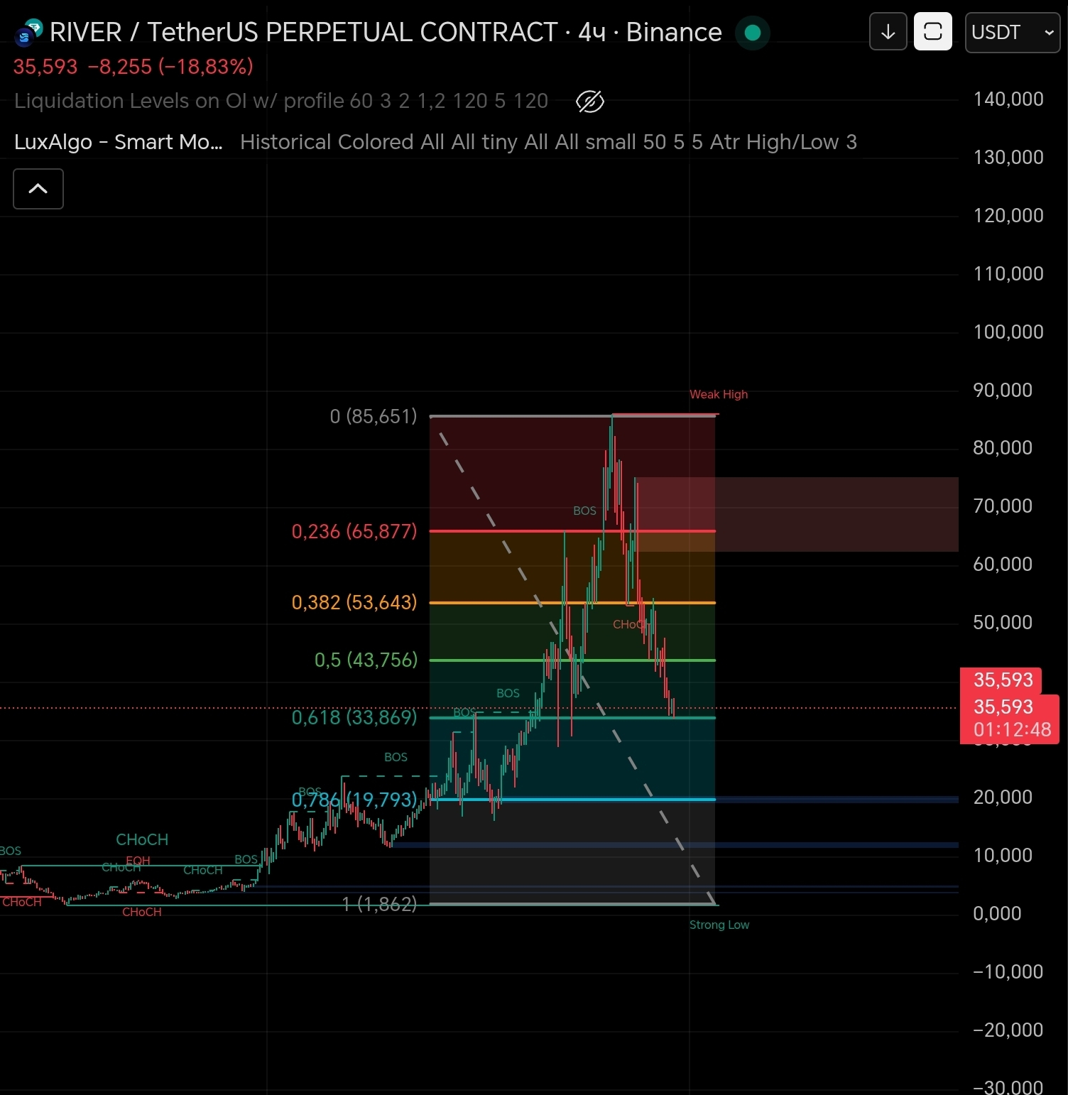 Mira por ti mismo, la moneda está solo en el nivel 0.618 de Fibonacci, es la segunda proporción áurea y el punto desde el cual más frecuentemente ocurre el cambio.