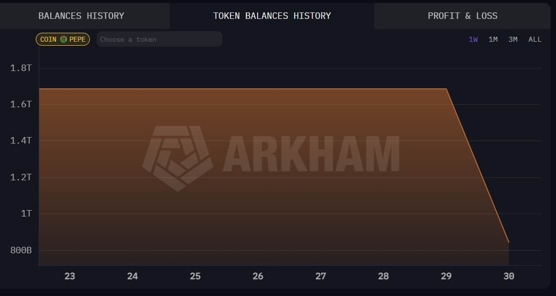 Según los datos de Arkham, incluso después de esta venta, la ballena aún posee 8420 millones de PEPE, con un valor de mercado de aproximadamente 3.82 millones de dólares. Es decir, esto no es un cierre pasivo, sino más bien una reducción activa de la exposición al riesgo cuando la tendencia se deteriora.