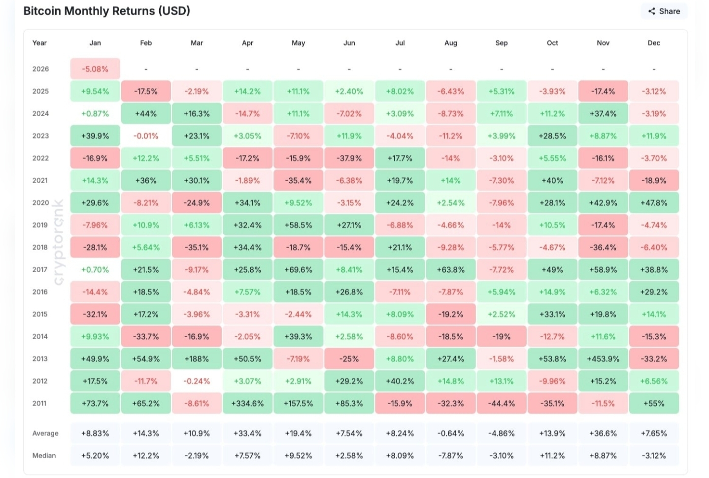Aunque enero de 2026 decepcionó a muchos, febrero puede traer un repunte. Esta opinión no se basa en un optimismo ciego, sino en el comportamiento histórico del precio de Bitcoin, según datos de CryptoRank.