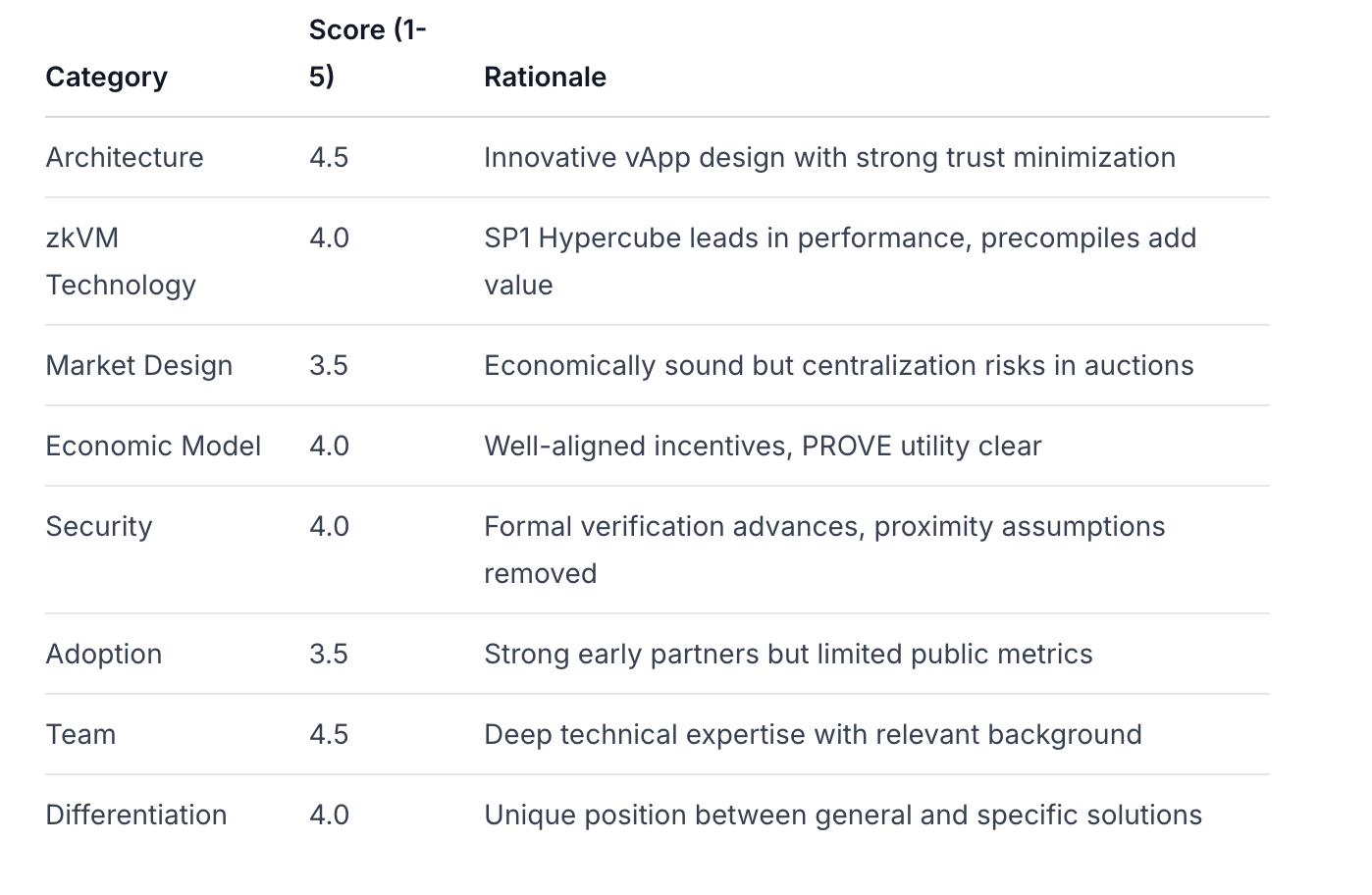 Recomendación: INVERTIR con un tamaño de posición que refleje el perfil de alto riesgo/alta recompensa. La diferenciación técnica y el posicionamiento en el ecosistema de Succinct justifican la inversión, pero el diseño del mercado de pruebas requiere una cuidadosa observación de las tendencias de centralización.