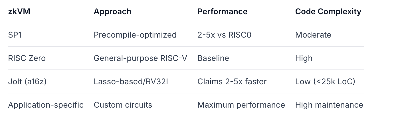 SP1 ocupa un terreno intermedio entre zkVMs de propósito general (desarrollo más fácil) y circuitos específicos de aplicación (máximo rendimiento). El sistema de precompilaciones permite una reducción de ciclos de 5-10x para operaciones criptográficas comunes en cargas de trabajo de blockchain.
