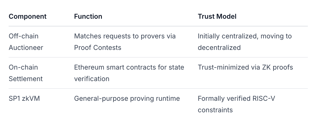 La arquitectura de Succinct emplea un novedoso patrón de aplicación verificable (vApp) que separa la ejecución de la liquidación, similar a los diseños de secuenciadores L2 pero optimizados para la generación de pruebas. Arquitectura