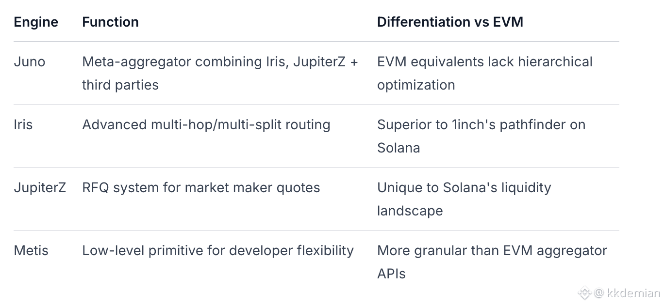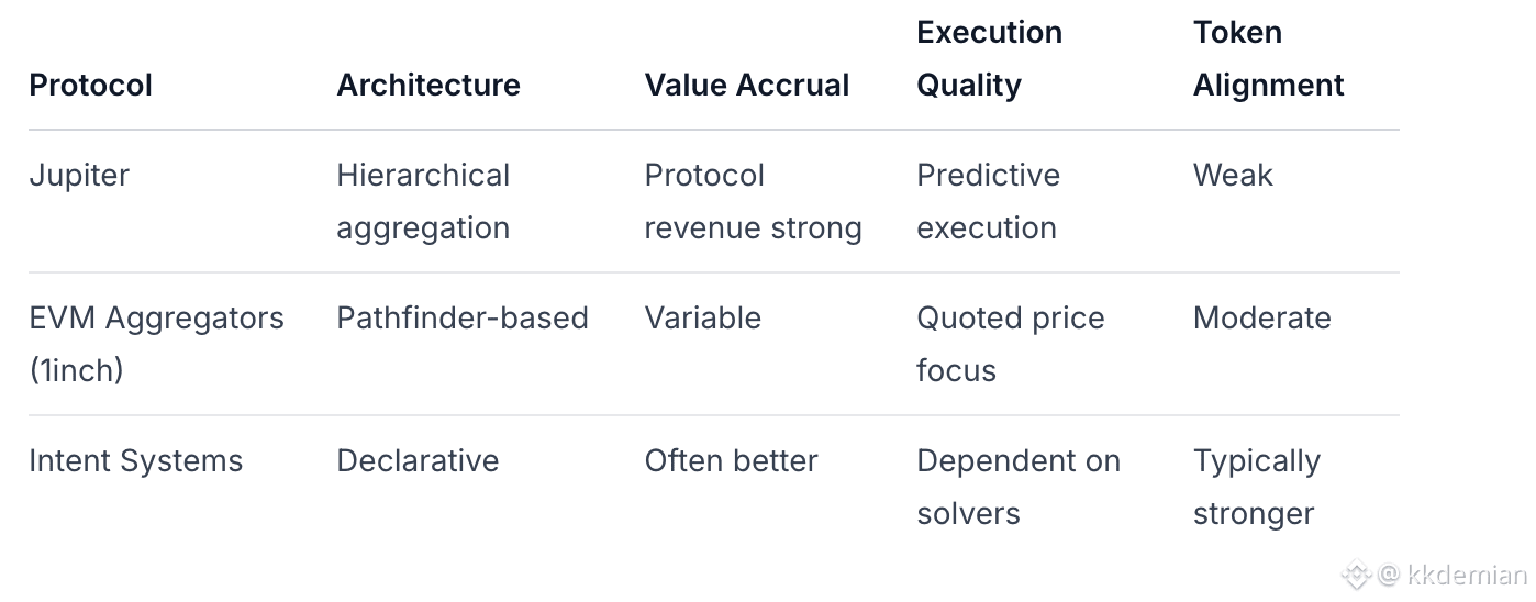Compared to EVM aggregators, Jupiter's architecture leverages Solana's parallel execution capabilities for more sophisticated routing logic and faster settlement.