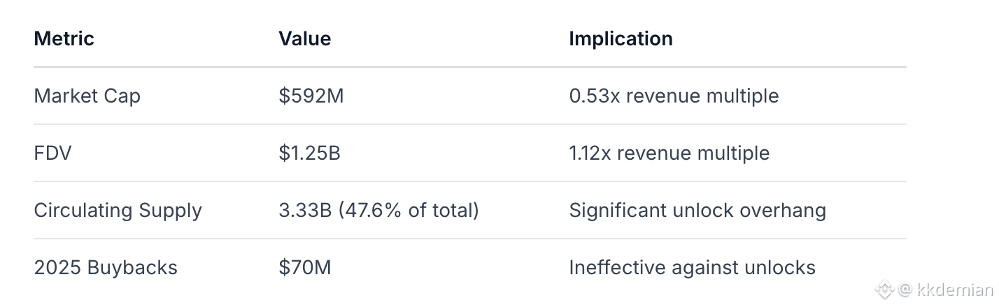 Economic Assessment: Protocol economics are robust ($1.11B revenue), but token value accrual remains weak. The 0.53x MC/revenue multiple suggests undervaluation if sustainable, but structural issues persist.