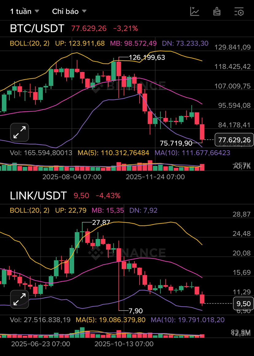 Las altcoins (LINK) sufren caídas significativamente más profundas, consistentes con su beta más alta cuando la liquidez del mercado se deteriora.
