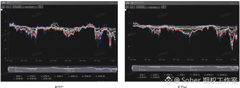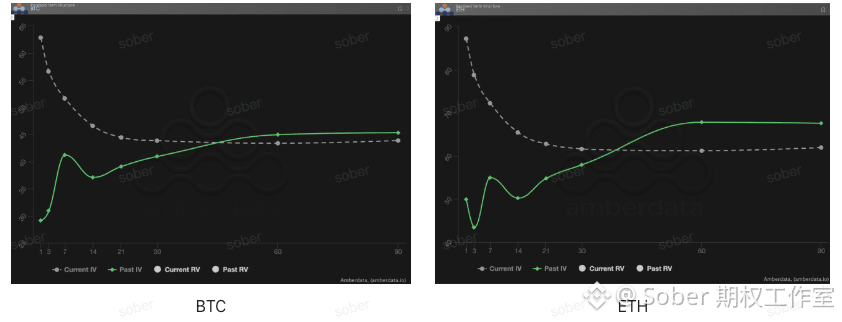 形态异动: 当前 BTC 与 ETH 的 Current IV 曲线均呈现出明显的倒挂形态,即近端隐含波动率显著高于中远端,未能回归典型的 Contango(近低远高)结构。与上周相比,本周近端 IV 再度抬升,而中远端 IV 仅小幅上移,导致整体倒挂程度并未缓解,甚至在部分期限区间有所加深。