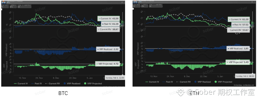 动态走势: 本周 BTC 与 ETH 的 IV 与 RV 同步上行,但 RV 的抬升速度更快,导致 VRP Realized 与 VRP Projected 均被压缩至个位数区间。与上周相比,卖方原本依赖的“高 IV – 低 RV”缓冲带明显收窄,期权定价正在向更接近公平波动率的状态回归。