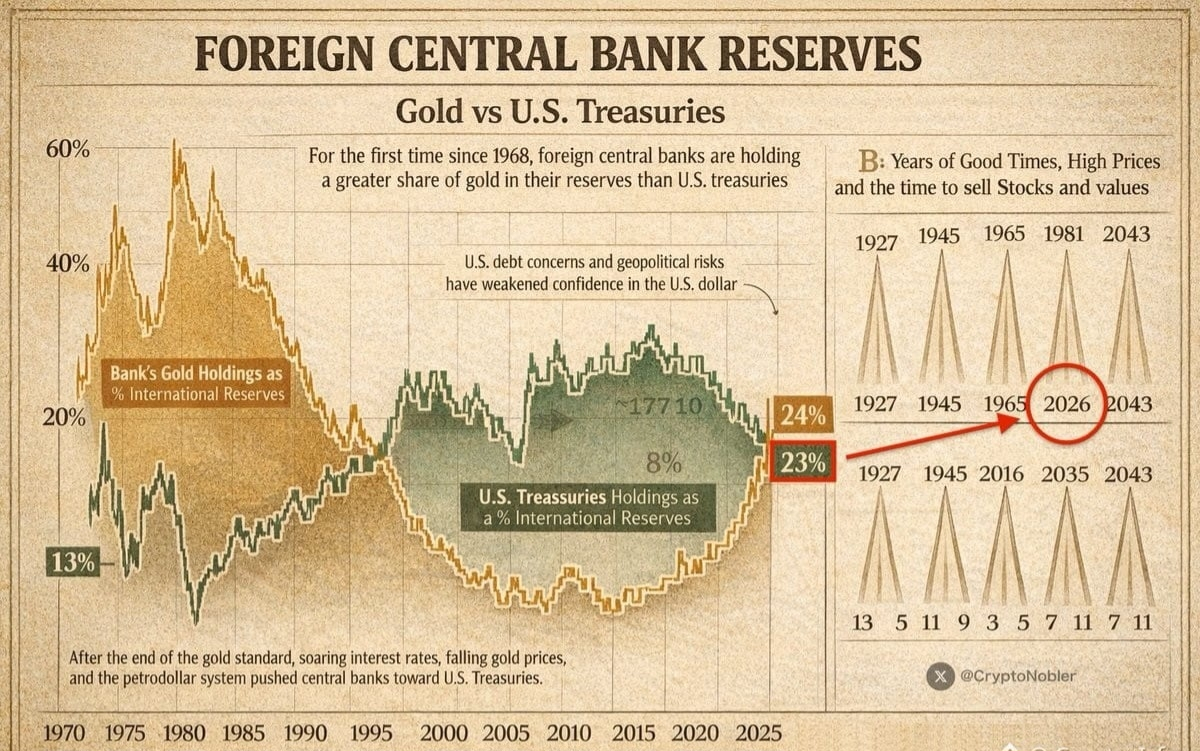 🚨 Se está produciendo un cambio histórico. Por primera vez en aproximadamente seis décadas, los bancos centrales en conjunto poseen más oro que los bonos del Tesoro de EE. UU. en sus reservas. Este cambio en la posición está levantando cejas en los mercados financieros globales y provocando un debate sobre lo que podría significar para el futuro del sistema monetario.