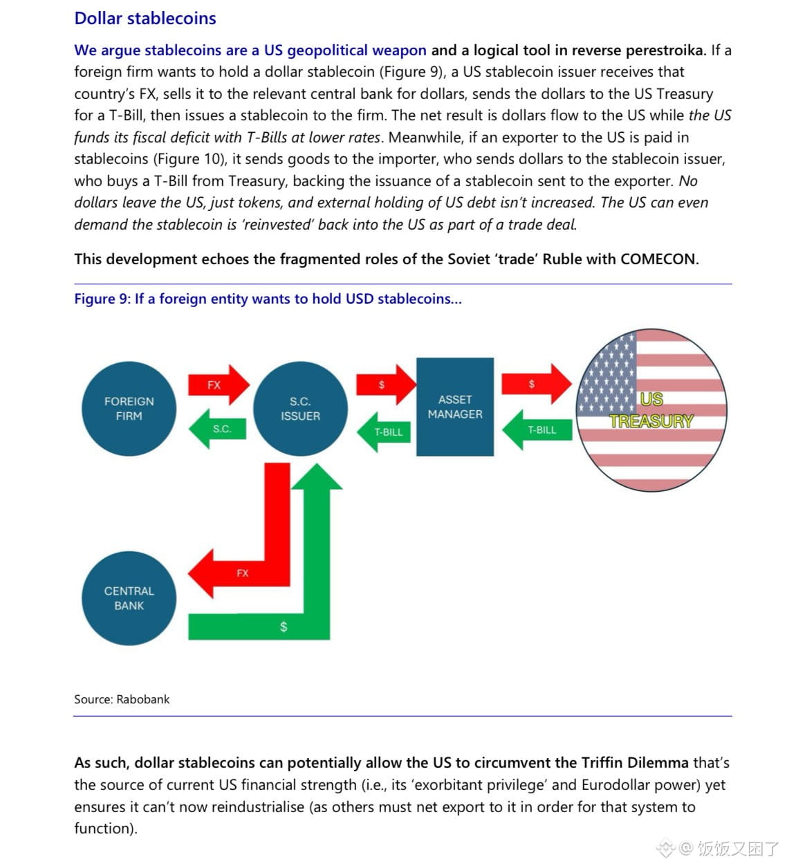在贸易场景中,这一机制更加巧妙。美国进口商用稳定币向海外出口商付款,但美元其实留在了美国国债里。换句话说,美元以数字形式“出海”,但真正的控制权依然掌握在美国手里。这有点像苏联时代的贸易卢布,但效果更现代化、更高效。
