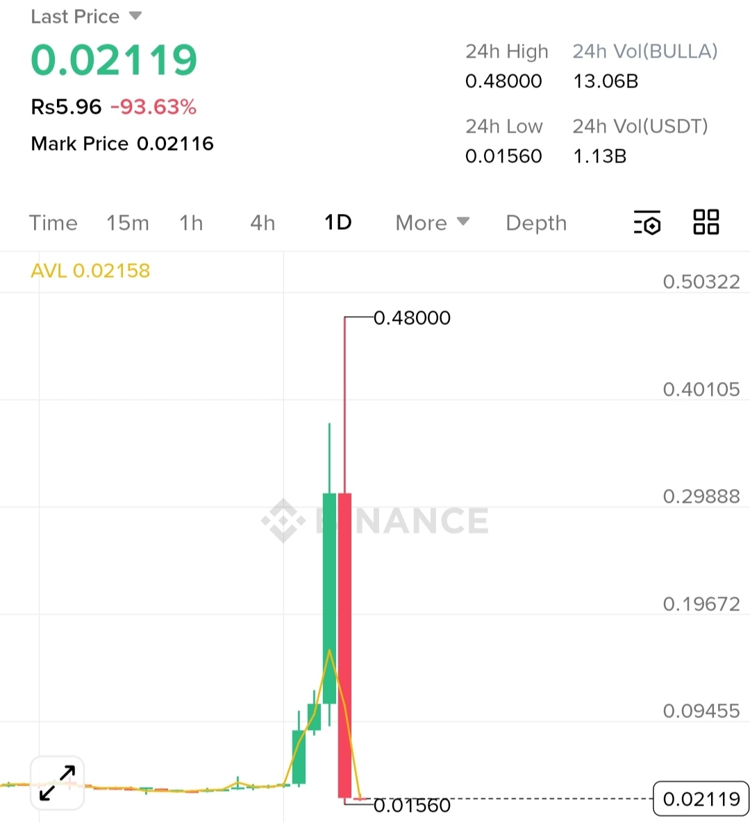 El precio de #BULLA USDT ha caído drásticamente (-93.63%) debido a una venta masiva repentina que empujó el precio de un máximo de 24h de 0.48000 al precio actual de 0.02119. Las posibles razones de tal caída incluyen: