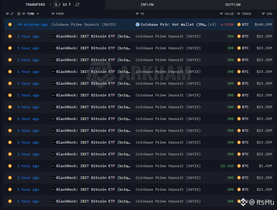 Tổng cộng hàng nghìn BTC được luân chuyển, kèm theo ~6.9K BTC nạp thẳng vào Coinbase Prime Hot Wallet.