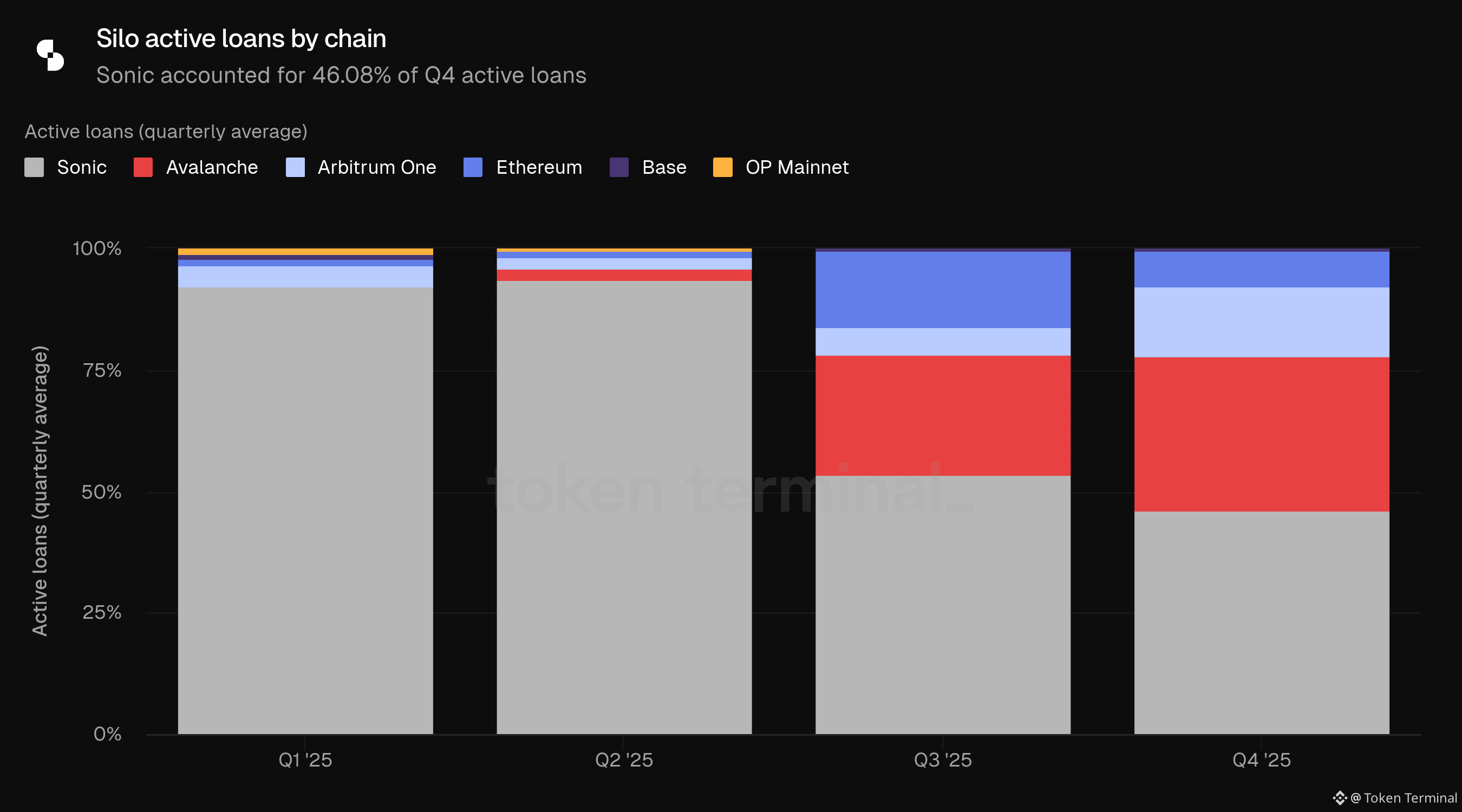 Active loans measures the total USD value of outstanding borrows across Silo lending markets. Q4 active loans averaged $122.23m, down 26.41% from Q3's $166.10m but more than triple Q4 2024's $38.30m. Sonic remained the largest chain for borrowing at 46.08%, despite falling to second place for TVL, suggesting higher utilization on that deployment. Avalanche grew its share from 24.86% to 31.99%, while Arbitrum One nearly tripled from 5.56% to 14.34%. Ethereum's share continued to decline, falling from 15.69% to 7.29%.