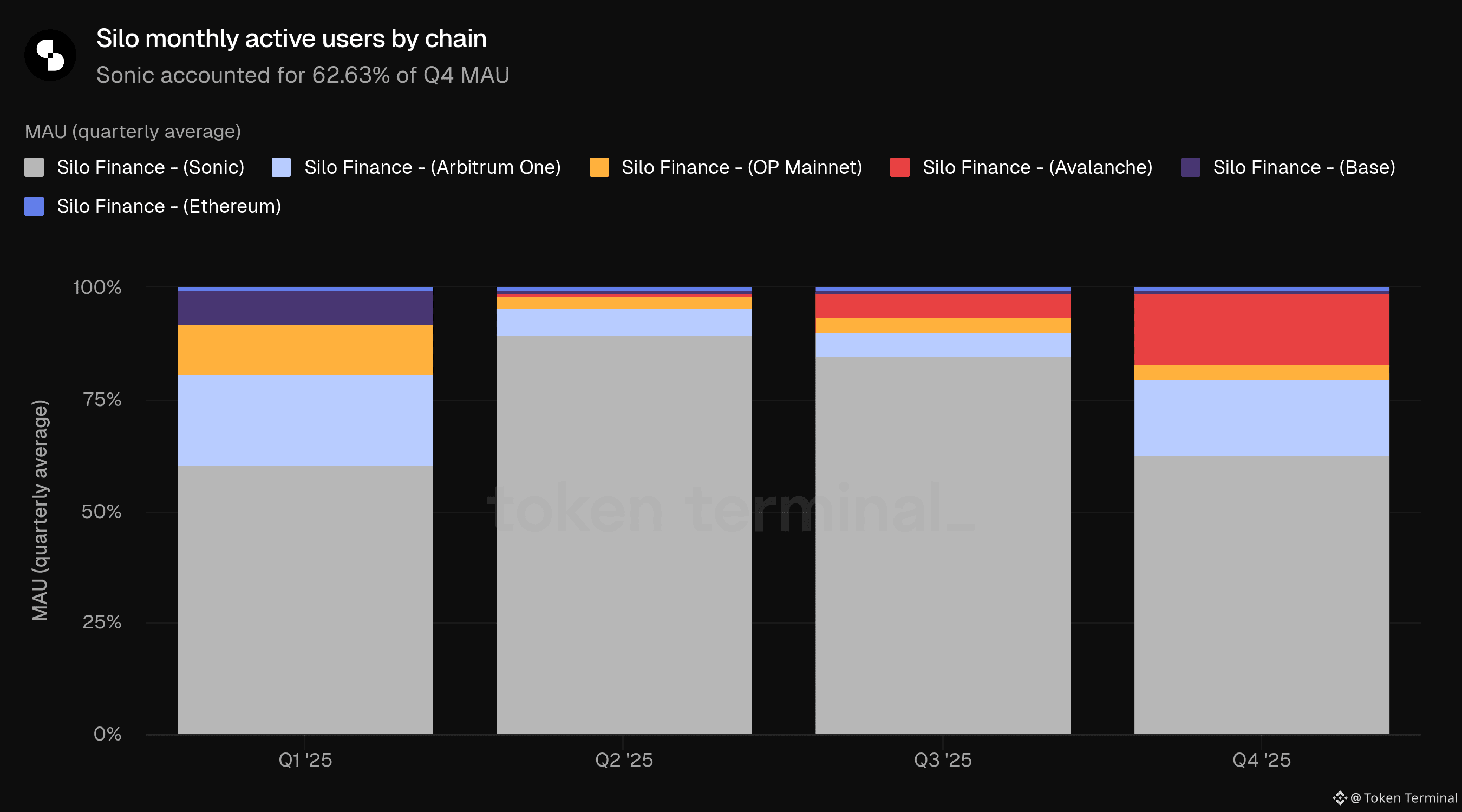 Monthly active users (MAU) measures the number of unique wallet addresses interacting with Silo over a rolling 30-day period. Q4 MAU averaged 6.60k, down 40.09% from Q3's 11.0k and down 30.63% from Q4 2024's 9.5k. Despite the decline in user counts, revenue per user increased substantially year-over-year. Sonic remained the largest chain for user activity at 62.63%, though its share declined sharply from 84.84% in Q3. Arbitrum One and Avalanche both saw notable growth, tripling their shares to 16.94% and 15.86% respectively.