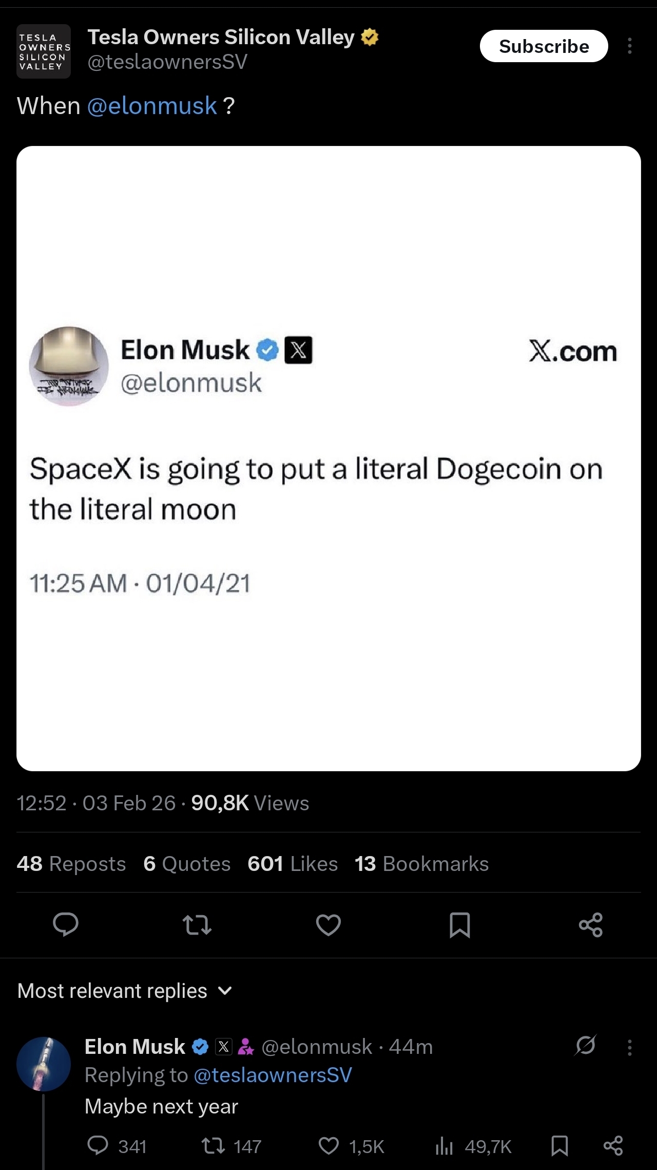 🗣️ Respuesta de Elon Musk a principios de 2026: “Quizás el próximo año” cuando se le preguntó sobre DOGE-1. Ni confirma ni desmiente, pero suficiente para causar revuelo.