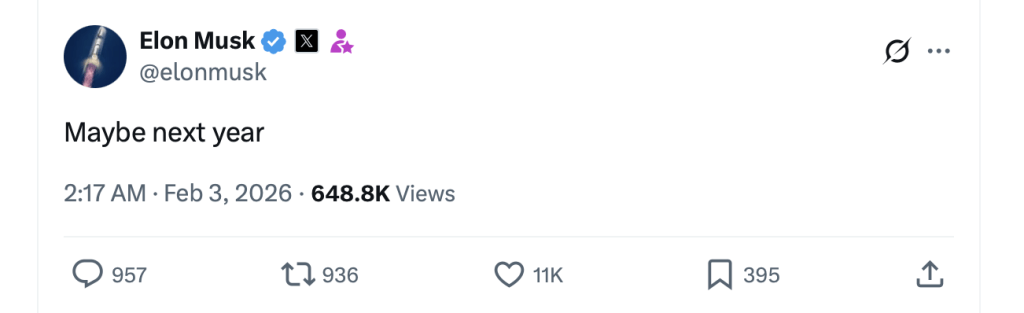 El martes, 3 de febrero de 2026, Elon Musk, conocido por su papel en X, SpaceX y Tesla, reavivó las especulaciones sobre el envío de una moneda Dogecoin física a la luna con una breve respuesta en la plataforma de redes sociales X: