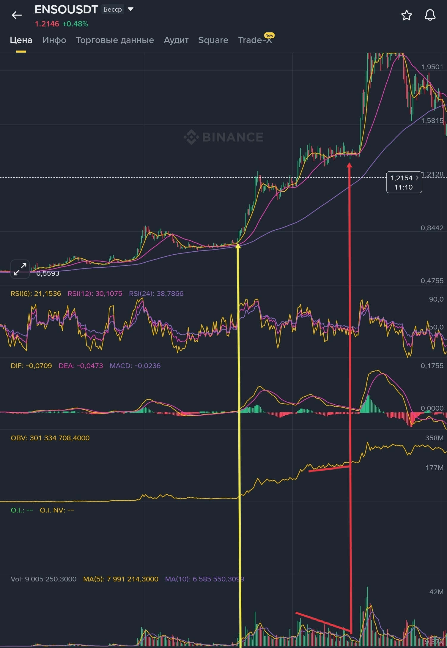 Первая желтая стрелка, вроде ничего особенного, цена почти не двигается, объемы падают, OBV вроде тоже на месте стоит, на самом деле там был небольшой рост сначала OBV, а потом уже VOL.