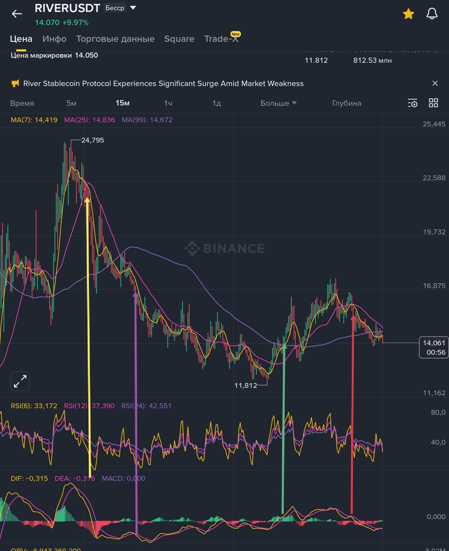 👀Первая жёлтая 🟡 стрелка, RCI6 88.90 индикатор говорит о перекупленности, а другие индикаторы, говорят о продолжении роста, МА7 только что пересекла ма 25 и снова забегу вперёд MACD линия dif (жёлтая 🟡 линия) только что пересекла dea (фиолетовая 🟣 линия) несмотря на перекупленность по RCI, падение или снижение цены отменяется.