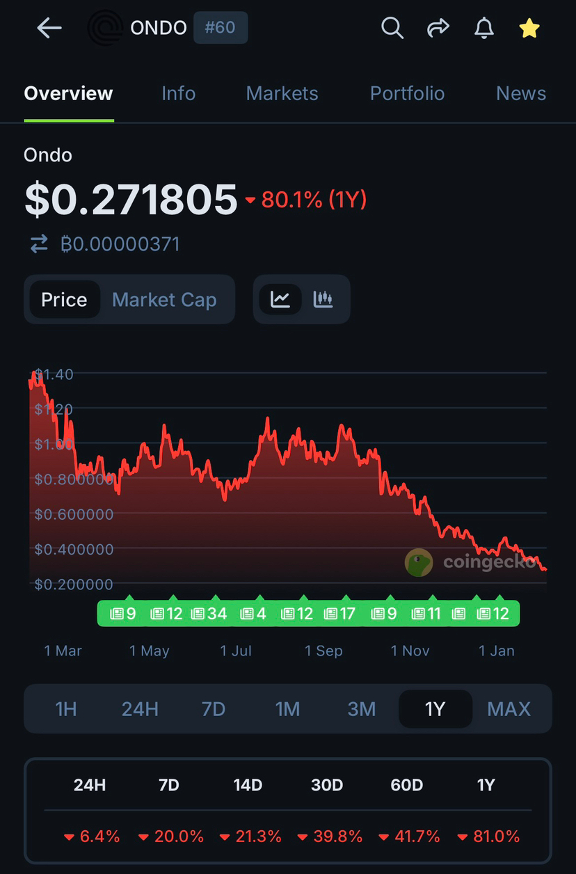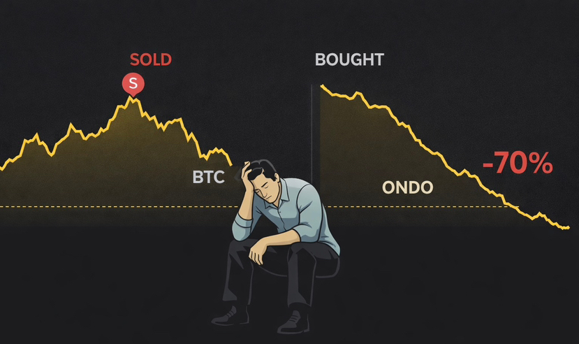 Una vez hice lo que muchas personas esperan: vendí Bitcoin cerca de la cima. Fue una decisión disciplinada y racional. Pero poco después de eso, tomé otra decisión impulsada no por un análisis frío, sino por la confianza construida sobre el éxito previo. Moví todo ese capital a promediar hacia abajo ONDO, creyendo que estaba optimizando mi cartera y posicionándome antes del mercado.