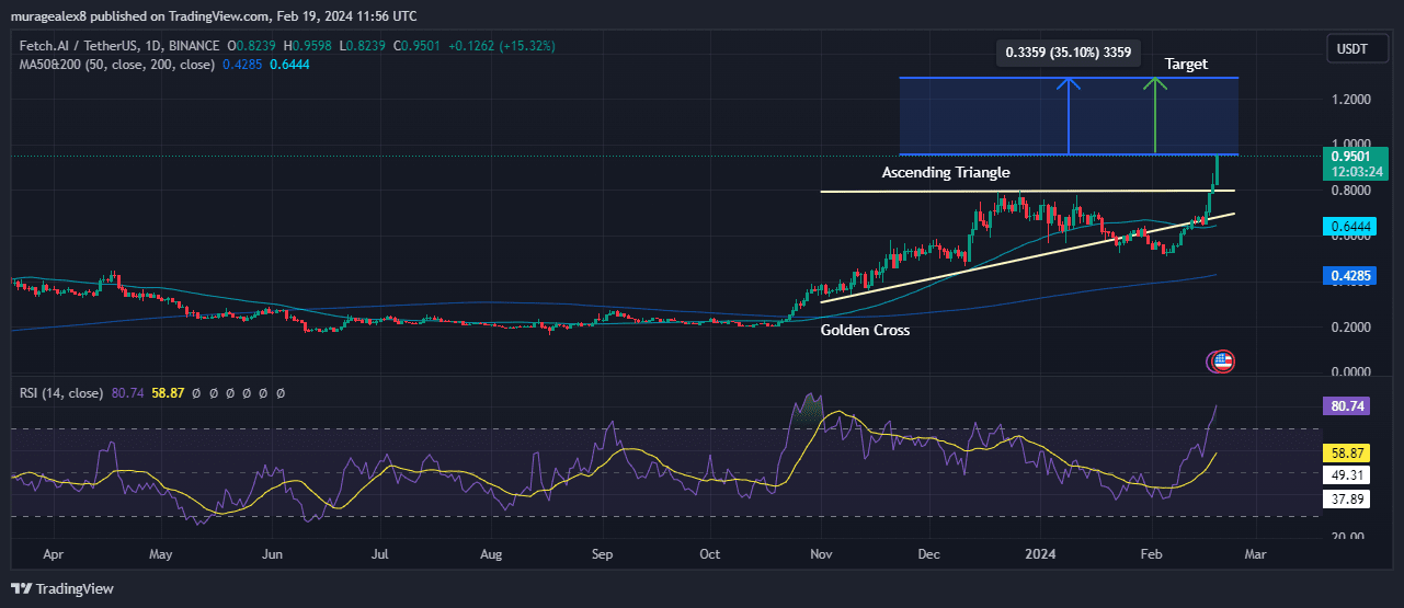 Desde noviembre, el FET ha seguido una tendencia ascendente, con un notable aumento del 86,98% en febrero. Los alcistas del mercado han utilizado efectivamente 0,508$ como nivel de soporte crucial, allanando el camino para romper el límite superior del patrón de triángulo ascendente.