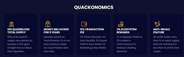 El token de la plataforma presenta una tarifa de transacción del 10% que se distribuye automáticamente a los poseedores de tokens RichQuack (QUACK) a través de un sistema automatizado de cultivo de rendimiento, así como una infraestructura de minería de liquidez.