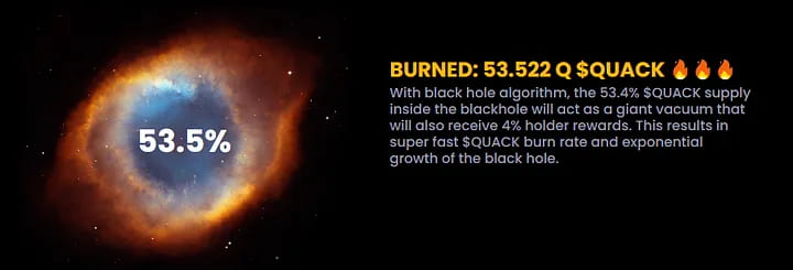 Se ha quemado el 53,4% del suministro de $QUACK y esto da como resultado una tasa de quema súper rápida que aumenta exponencialmente como resultado de este mecanismo de quema. Debido a que QUACK es un token BEP-20 con un suministro total de 100 cuatrillones, una reducción del 53,4% significa que su suministro total se ha reducido a aproximadamente 45 cuatrillones.