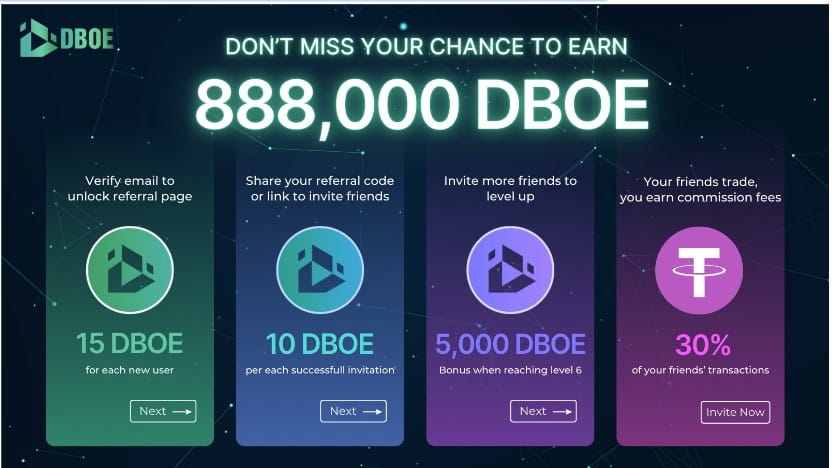 Bonificación por recomendar amigos: +500 DBOE al recomendar hasta 100 amigos; +5000 DBOE al recomendar hasta 500 amigos.