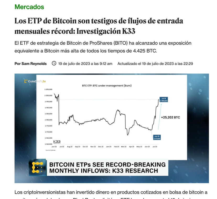 De hecho, tal y como ha reflejado una investigación de k33, los ETPs de Bitcoin han logrado romper el record de volumen de inflows mensuales, con el ETF de Proshares BITO, logrando un Máximo Histórico de 4,425 Bitcoins de exposición.