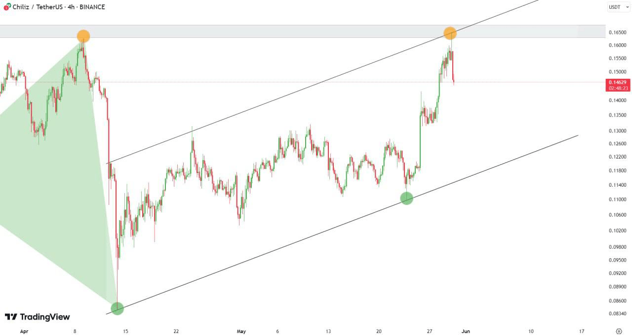 El precio de Chiliz (CHZ) formó recientemente un canal ascendente en el marco de tiempo de cuatro horas. Esta estructura técnica muestra que el precio fluctúa constantemente entre máximos y mínimos dentro de un cierto rango. A pesar del movimiento correctivo de Bitcoin, Chiliz está experimentando actualmente una tendencia alcista, lo que indica que las altcoins pueden tener su propia dinámica de precios independiente de los movimientos de Bitcoin.