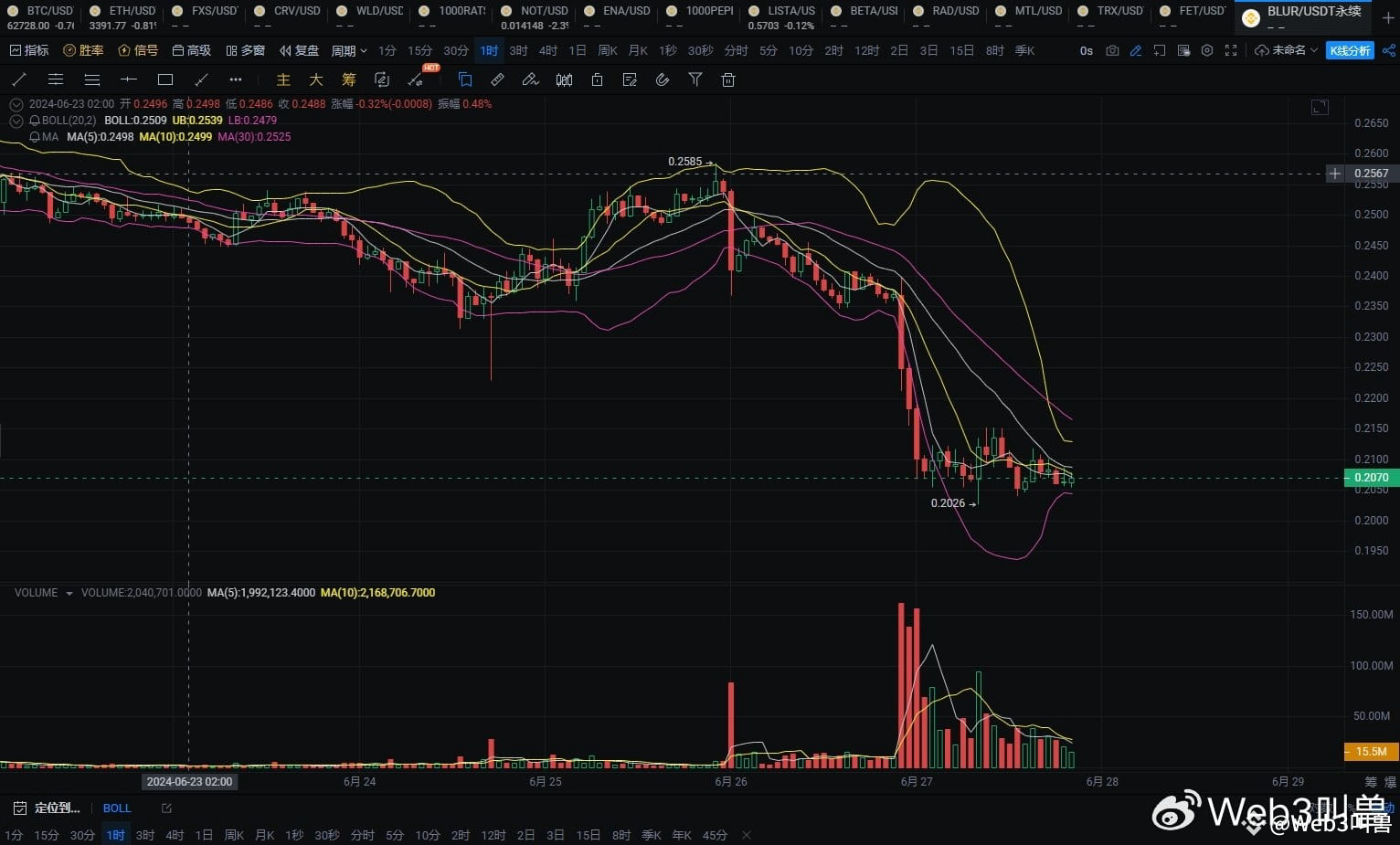 3. 实时数据 截至2024年6月24日,BLUR价格为0.2060美元,Bollinger带中轨在0.25美元,上轨在0.30美元,下轨在0.20美元。