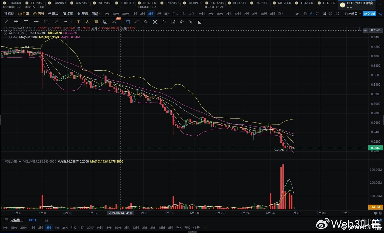 1. 价格趋势 BLUR在4小时图上显示出持续下跌的趋势,价格运行在下行通道内。