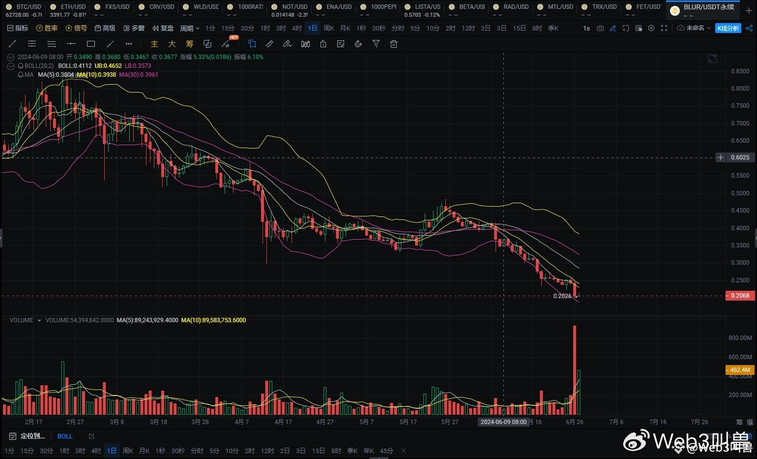 3. 实时数据 截至2024年6月24日,BLUR价格为0.2060美元,5日均线在0.27美元,10日均线在0.30美元,30日均线在0.35美元。