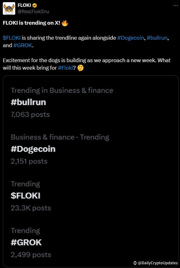 Trending Alongside Big Names: FLOKI is trending on X, sharing the spotlight with other major hashtags like #Dogecoin, #bullrun, and #GROK.