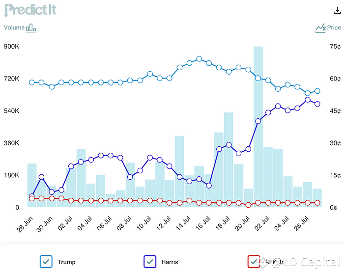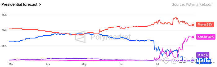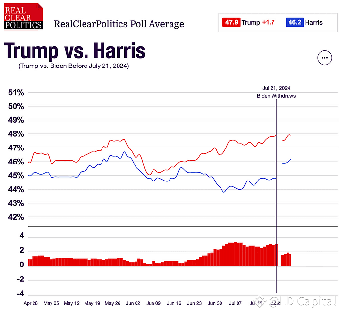 从6月27,拜登在辩论中表现不佳,导致他在民调中的地位下降,民主党内部出现了更换候选人的呼声开始到特朗普遭遇暗杀未遂事件,到拜登上周正式退选,政治局势发生了众多大事。