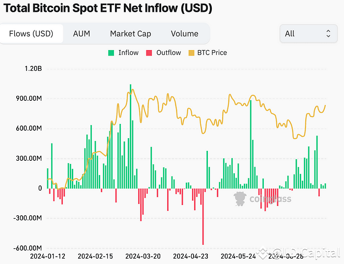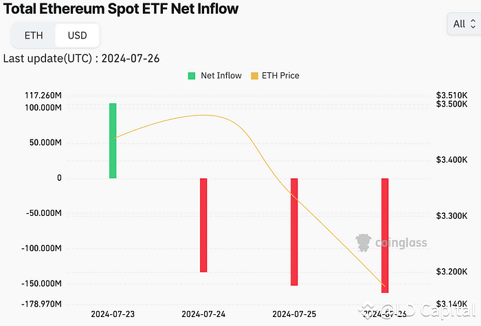 ETF在7月大部分时间里维持净流入只有3天是净流出,净流入30亿美元是3月份以来最好的一个月表现: