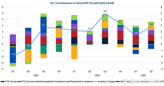 周四公布的2024年二季度美GDP环比年化增长2.8%,高于预期2.0%,较一季度的1.4%显著回升。,并且分项数据显示这次 GDP 的上涨相对广泛,消费、投资、补库存和政府都有不小的贡献,并且服务消费放缓,表明美国的二季度的复苏势头强劲且健康。GDP公布后美元和美债利率反弹,美股短暂下跌后反弹。目前市场预期2024全年美国经济增速仍将达2.3%,二季度为全年高点,三、四季度经济内需放缓。